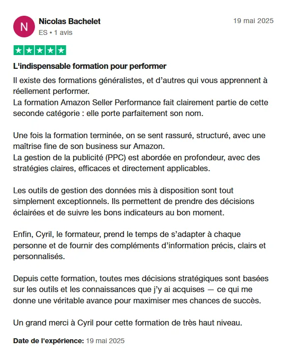 Avant de créer le parcours Amazon Seller Performances, j’ai testé et appliqué mes stratégie pendant 5 ans sur Amazon pour des petites boutiques à quelques milliers d’euros comme pour des grands comptes qui génèrent plus de 500 000 euros de CA par mois.
