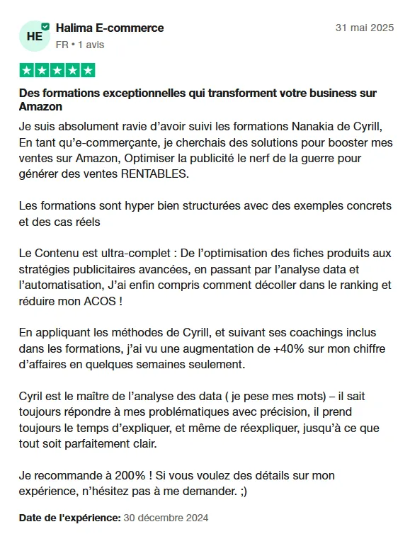 🎯 Idéal pour les vendeurs Amazon ambitieux qui veulent sécuriser leur croissance avec un suivi rapproché.