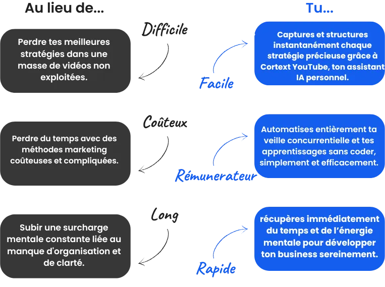 Et si je te disais qu’il existe une méthode révolutionnaire pour transformer instantanément des heures de vidéos YouTube en stratégies concrètes et immédiatement exploitables grâce à une intelligence artificielle spécialement conçue pour les entrepreneurs et e-commerçants débordés ?